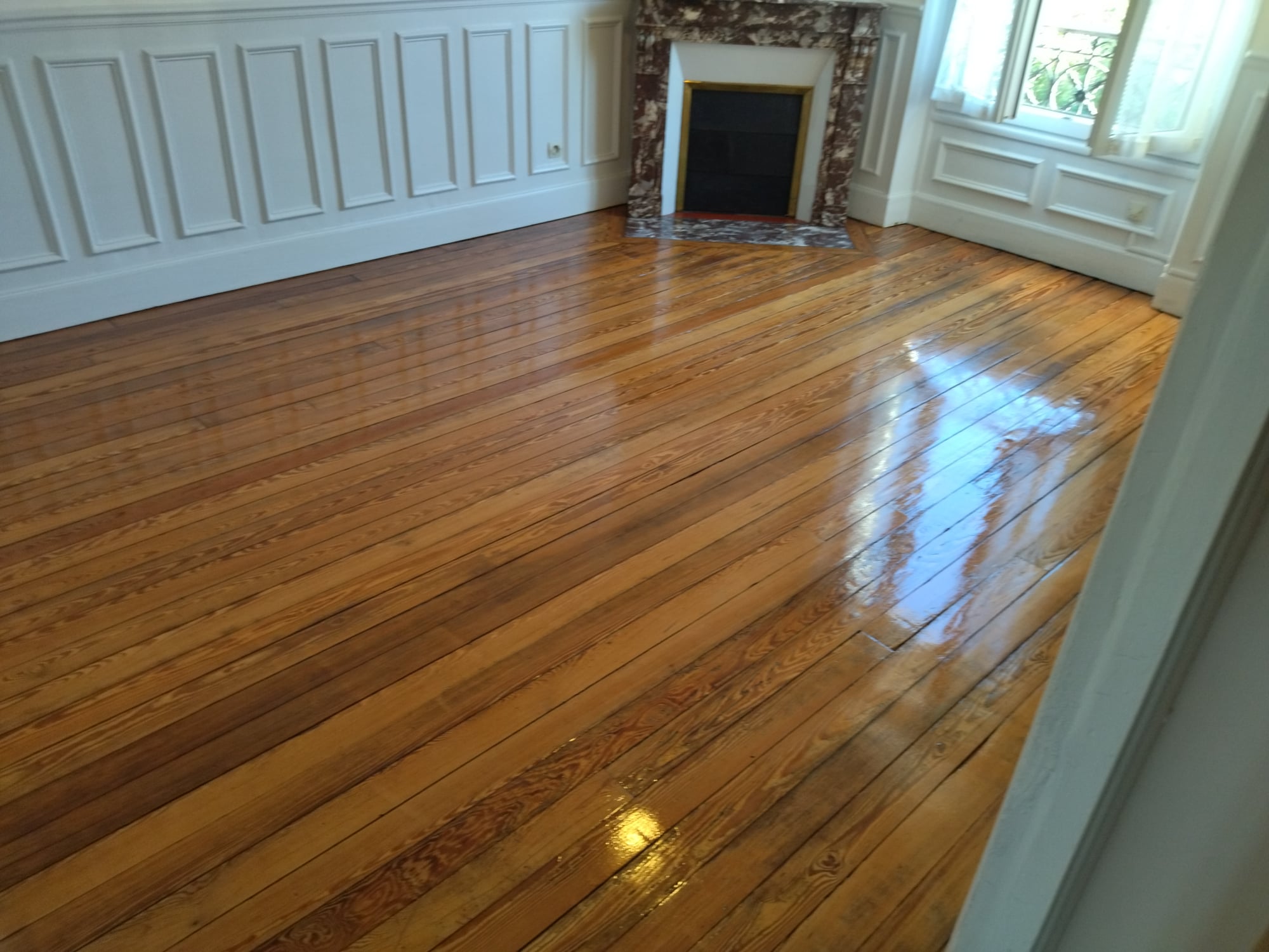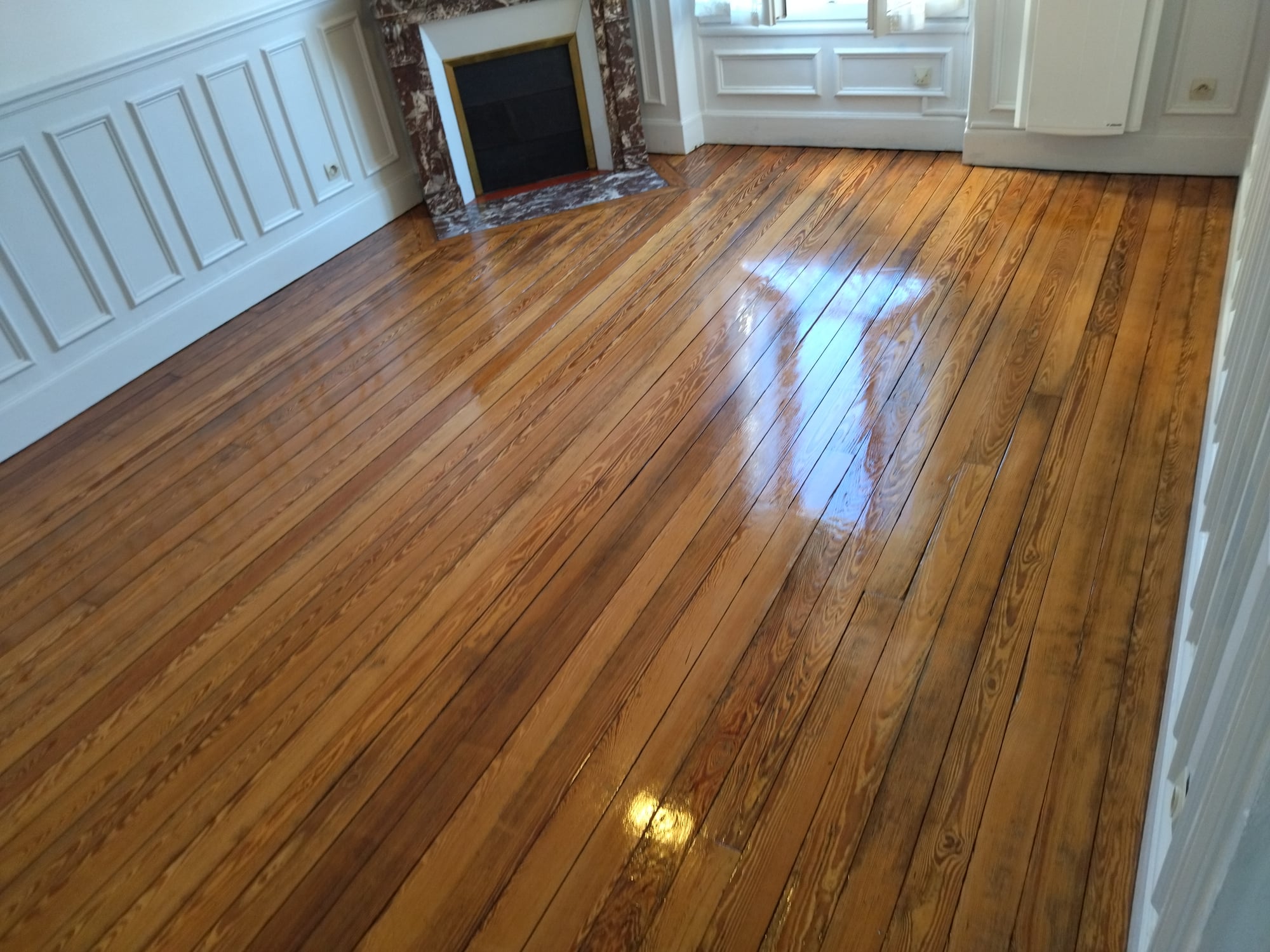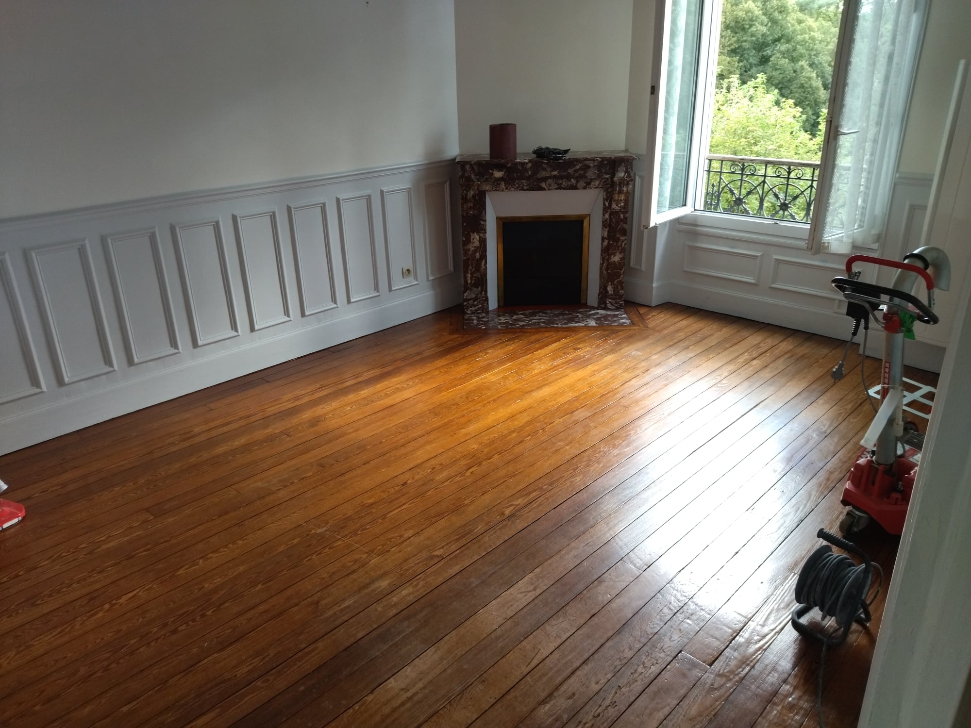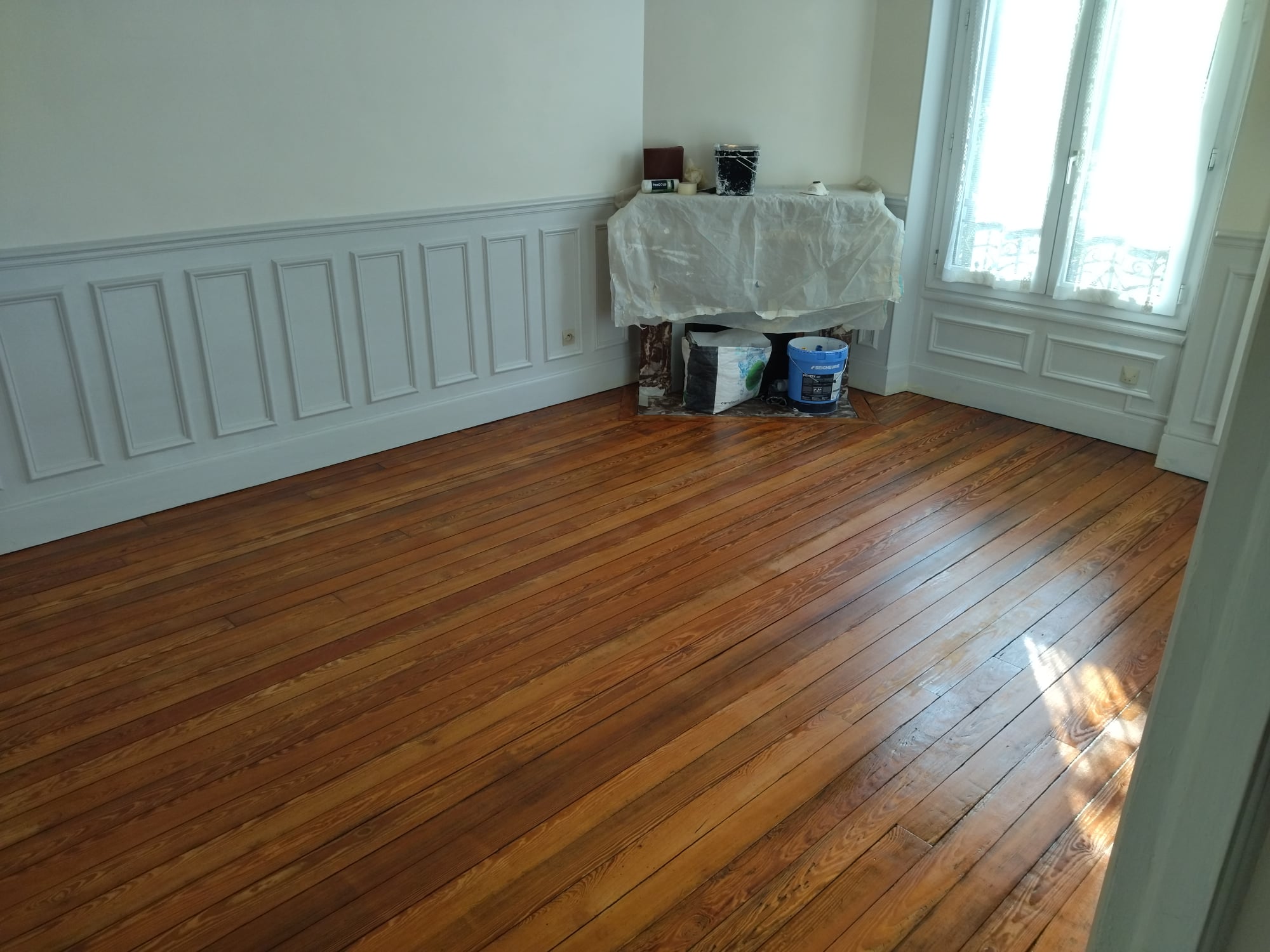 Vitrification de parquet : les parquets ont tout d’abord été poncés avant l’application de fondur et deux couches de vitrificateur satiné incolore, pour rendre aux parquets une teinte proche de leur origine.